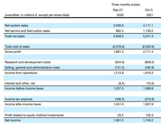 앞서 말했듯 이번 분기 ASML의 Sales는 YoY+32.4% 증가하였습니다. 하지만 이에 반해 cost of sales는 7% 증가한데에 그쳐Gross profit margin은 2020년 동분기 47.5%에서 51.7%까지 올라온 것을 볼 수 있습니다. 규모의 경제가 이뤄지면서 생산 효율화가 나고 있다는 증거겠지요. 또한 이러한 Margin의 상승은 EUV 장비의 가격 상승도 한 몫하였습니다.