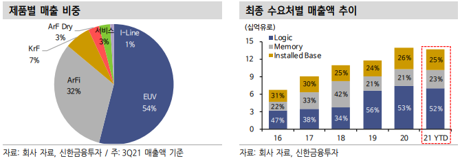 주목할 점은 최종 수요처별 매출액에서 Memory 매출액 비중이 높아졌다는 것입니다. 이는 DRAM(메모리) 공정에서도 본격적으로 EUV의 장비가 도입되고 있기 때문인데요. 대표적으로는 삼성전자의 DDR5가 EUV 공정을 이용하여 제품을 생산하고 있습니다. 삼성전자뿐 아니라 SK하이닉스, 마이크론, 난야 등 주요 DRAM 업체들도 EUV 도입을 공식화했다는 점에서 EUV 장비가 Logic 반도체뿐 아니라 메모리에서도 투 트랙의 성장성을 확보했다는 점이 매우 긍정적입니다.