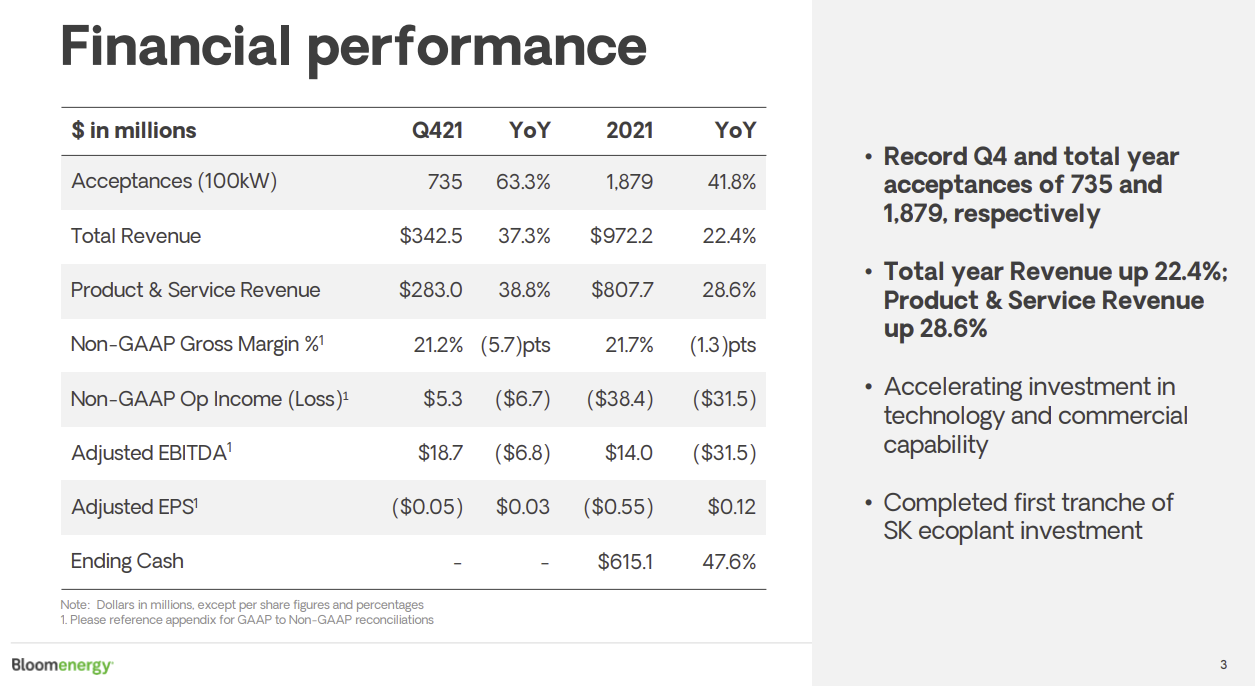 미국 현지 시간 기준 2/10일 장 마감 이후 블룸에너지의 2021년 4분기 실적발표가 있었습니다.