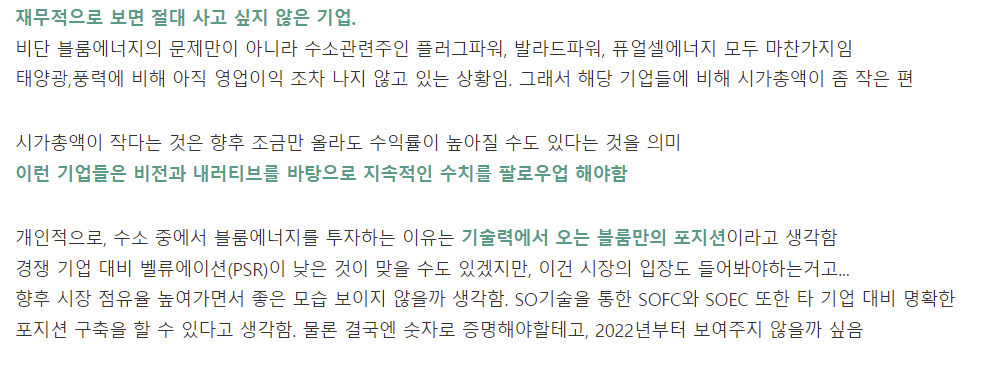 즉, 화석연료 중에서 넷 제로 상황 속에서 꾸준히 사용될 연료는 '천연가스'임. 화석 대비 배출량도 적고 블룸에너지 기술을 이용하여 포집도 가능함. 이런 점들이 부각되면 순수 수소에서만 매출이 나는 것이 아니라 기존 매출도 유의미하게 반영될 것으로 전망함.