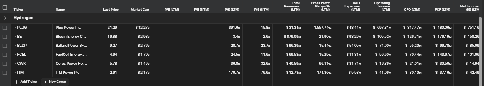 P/S가 절대적인 벨류에이션 정답은 아니지만, 수소 기업들 P/S를 보면 현재 블룸에너지의 P/S는 3.4x 수준으로 경쟁기업 대비 매우 낮음.(다시 말하지만 P/S가 정답은 아님. EV/EBITDA도 있고 향후 P/E로 봐야 할 수도 있음)