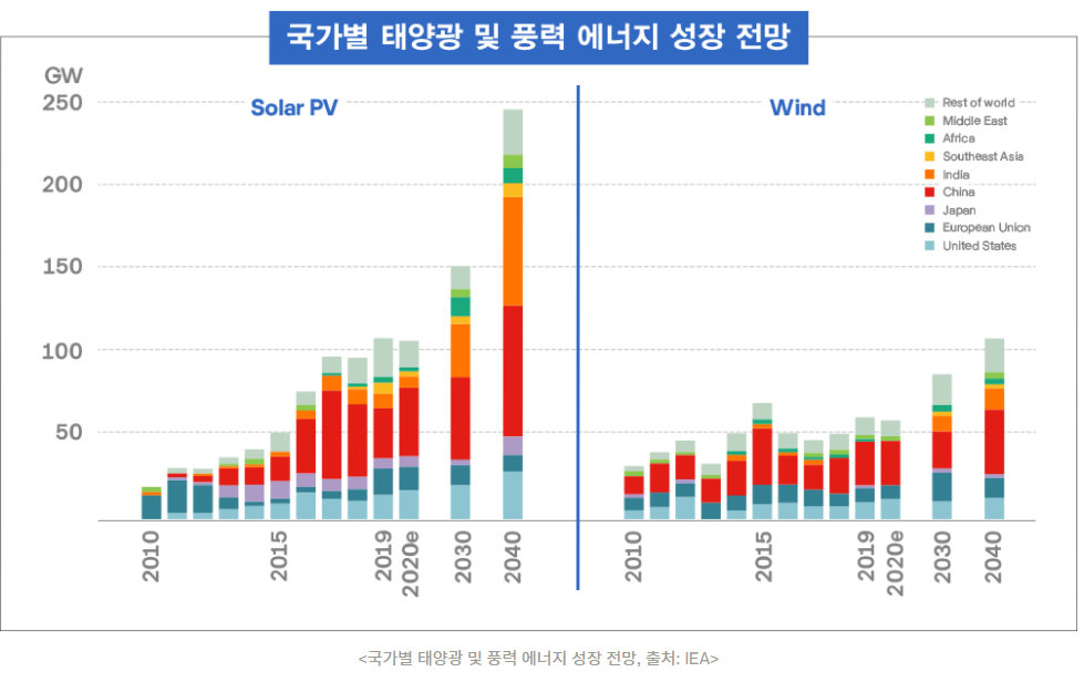그러면 단가 측면에서 태양광과 풍력으로 좁혀졌는데, 그 다음은 성장성을 봐야겠죠. IEA에 따르면 위에 보시는 그림과 같이 태양광 에너지는 2030~2040 정말 폭발적인 성장을 예고합니다. 저는 어차피 지금 돈이 없어서(눈물이 납니다...) 10년~20년 뒤에 수확을 걷을 수 있는 투자처를 찾고 있기 때문에 2030년, 넘어서 2040년을 바라본다 했을 때 풍력보다는 태양광에 투자를 하는 것이 합리적이다라는 생각을 하게 되었습니다.
