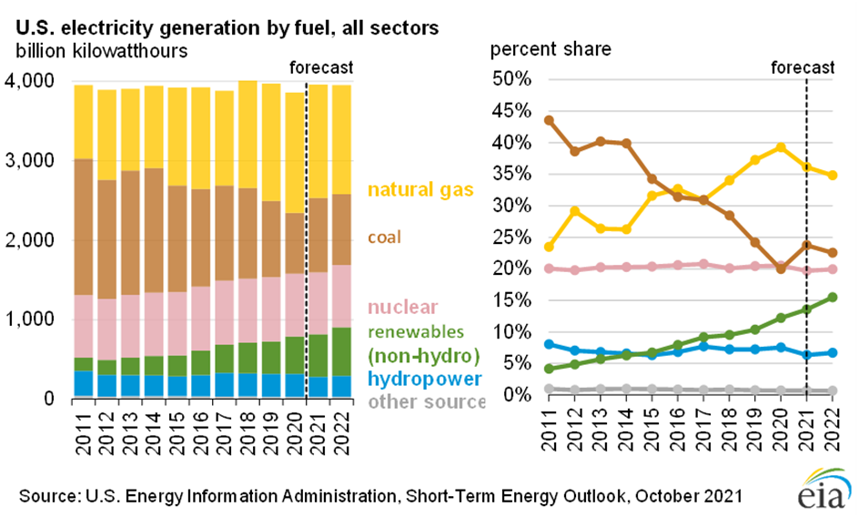 첫 번째로는 태양광 단가가 굉장히 경제적이라는 이유입니다. 2009년만 해도 태양광의 단가는 $380 ($/MWh)였지만 2021년 기준으로 $38까지 수직 하락을 해왔습니다. 수치로만 보면 무려 90% 가량의 원가 절감이 이루어 진겁니다. 풍력 역시 2009년 $276($/MWh)에서 2021년 $38까지(72%) 원가 절감을 이뤄낸 걸 볼 수 있습니다. 현재 절대 가격으로만 봐도 천연가스(최근 매크로적 이슈 때문에 천연가스 가격이 폭등을 하고 있는데, 이러한 사안도 태양광에는 좋은 환경이라고 생각합니다), 원자력 등에 비해서도 경제적인 걸 확인할 수 있습니다.