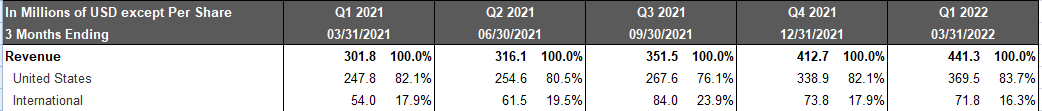 1Q22 매출은 441.3M 으로 YoY +40%, QoQ +7% 상승하였으며 컨센서스인 429.9M도 상회를 하였습니다.