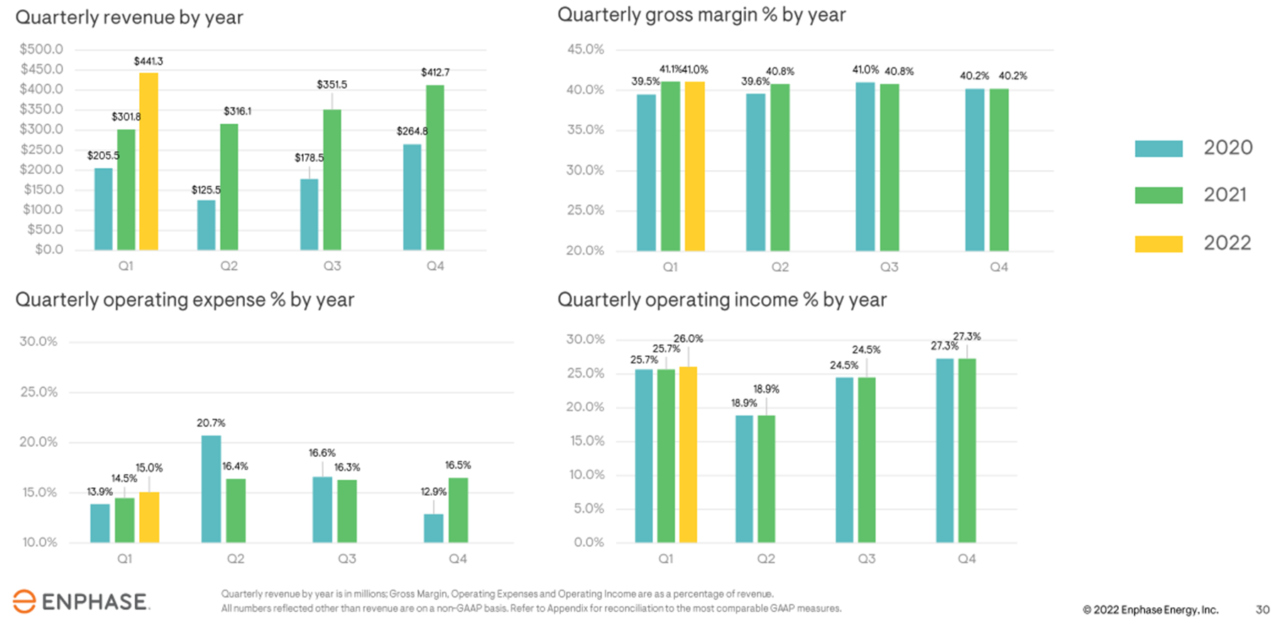 : 해당 발언은 엔페이즈뿐 아니라 여러 기업에 적용해볼 수 있습니다. 현재 인플레이션 환경이 병목으로 인해 더욱 심화되고 있는데요. 엔페이즈는 올해 말 병목이 일부 해소될 것으로 내다봤으며 ASML 실적 발표에서도 비슷한 언급이 있었습니다. 따라서 올해 말에는 공급망 차질을 겪고 있던 기업들의 실적이 반등할지 지켜봐야할 것 같습니다. 어찌됐든 현재 엔페이즈가 병목 현상이 완연한 데에도 불구하고 다음과 같은 실적을 냈다는 데에는 상당히 고무적입니다. 병목이 풀리면 더욱 더 미친 듯이 성장하겠네요. - IQ8은 이번 분기 북미에서 런칭했으며, 반응 역시 매우 뜨겁다. 하반기에 유럽, 호주에 도입을 예상한다.