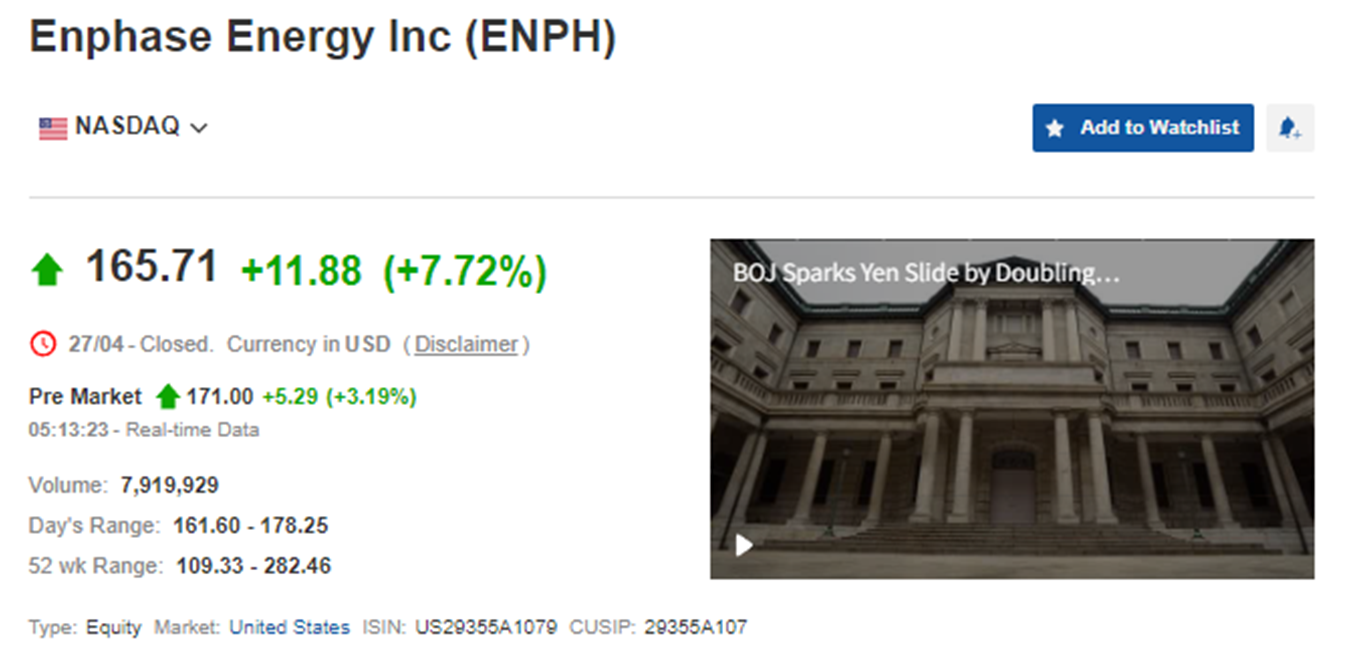 오늘은 제가 사랑하는 기업인 엔페이즈에너지(ENPH US)의 실적 발표 및 컨퍼런스 콜 분석을 가지고 왔습니다. 결론부터 말씀을 드리면 엔페이즈의 이번 실적은 매우 성공적이었습니다. 1분기는 태양광 섹터에 대한 우려를 불식시켜주었으며, 2분기 가이던스도 엄청나게 좋게 주면서 실적 발표 다음 날 15% 가량 상승하기도 하였습니다. 다만, 중간에 시장이 하락하면서 +7.72% 상승으로 마감하였네요.