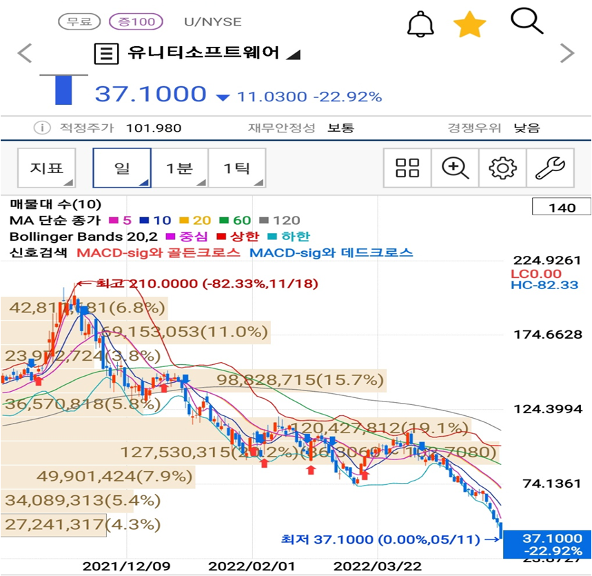2) 그럼에도 불구하고 단기 주가 상승은 부정적으로 보고 있습니다. 첫 번 째로는 매물대에 있습니다. 기술적인 접근법을 싫어하긴 하지만 현재 유니티가 상장 이래 최저가를 기록하고 있는 상황에서 주가가 다시 예전 주가로 회복하기 위해서는 내려온 주가들을 다시 거쳐서 올라가야 합니다. 그 과정에서 수많은 매물(물려있다가 본전오면 던지는 매물)들을 모두 소화하면서 올라가야겠지요.
