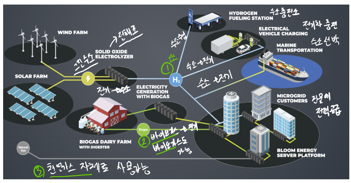 A : SK에서 최소 500MW는 확정이고, SK는 복합체(지주 개념? 혹은 글로벌 지역?)로 단순히 에너지뿐만 아니라 부동산 등 다양한 것을 하고 있다. SK가 글로벌에서 건설, WTE, Biogas, 재활용 천연가스, 파이낸싱까지 진행하며 확장시켜줄 수 있음. sk에코 비즈니스가 친환경 관련된 다양한 일이고 대부분의 업무에 기술/제품적으로 블룸이 공급이 가능하다는 점을 얘기하고 싶은 듯.
