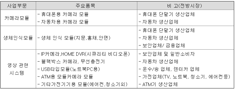 오늘 소개해드릴 종목은 엠씨넥스입니다. 엠씨넥스는 CCM기술을 기반으로 설립한 영상 전문기업으로써 휴대폰용 카메라모듈과 자동차용 카메라모듈을 주력제품으로 생산하고 있습니다. 그 외에도 홍채인식 모듈, 지문인식 모듈 등 프리미엄 부품에 대한 지속적인 기술 개발을 하고 있는 기업입니다. 엠씨넥스가 영위하고 있는 제품군을 간단하게 보시겠습니다.