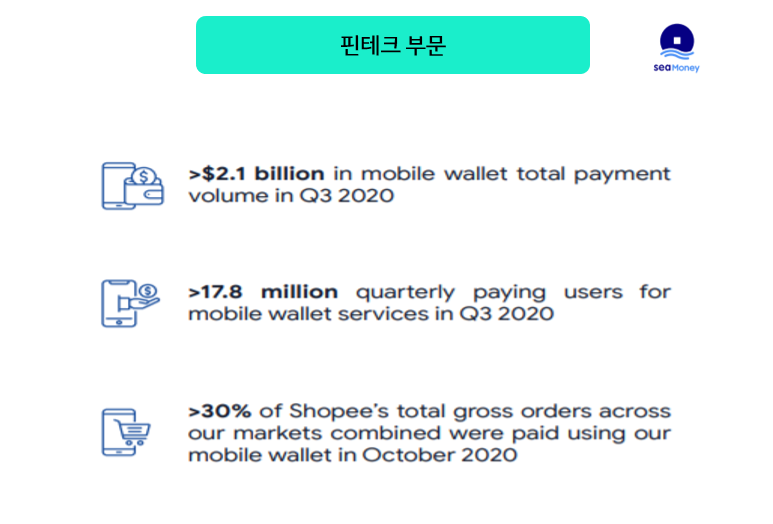 핀테크 부문의 결제 대금은 21억, 유저수는 1,780만명, 쇼피의 주문 중 30% 이상이 씨그룹 핀테크 부문을 통해 결제되고 있습니다.