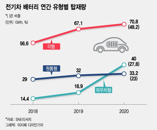 현재 전기차용 시장은 셋으로 나뉘어 있습니다. 1) 각형 2) 원통형 3) 파우치형 이죠. 현재까진 뭐가 더 우수하다는 기준은 없지만 각형 배터리는 공간 효율을 효율적으로 할 수 있고 내구력도 강하다는 장점이 있는 대신 무겁고 대형화가 어려운 단점이 있습니다. LG화학과 SK이노베이션이 공급하는 파우치형 배터리는 다양한 모양으로 생산 가능하고 공간 역시 효율적으로 사용할 수 있지만 배터리 내부 안정성이 약하고 내구력이 낮다는 단점이 있습니다.