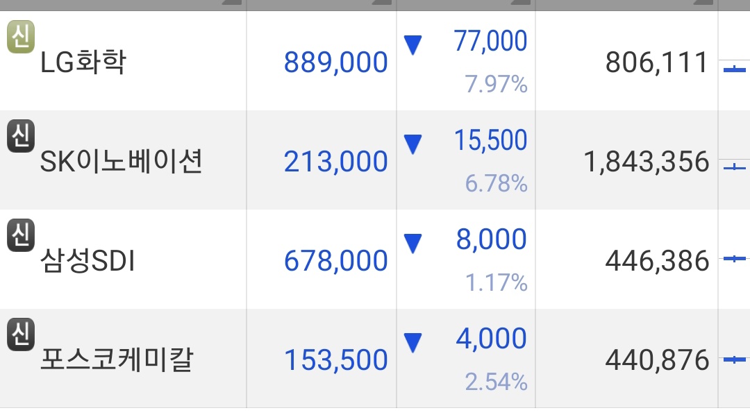 특히 파우치형 배터리를 생산하는 LG화학과 SK이노베이션이 큰 폭으로 하락하였으며 각형 배터리를 생산하는 삼성SDI는 소폭의 하락폭을 받았습니다. 포스코케미칼은 LG화학과 SK이노베이션에 양음극재를 공급하기 때문에 함께 하락폭을 받은 모습입니다.