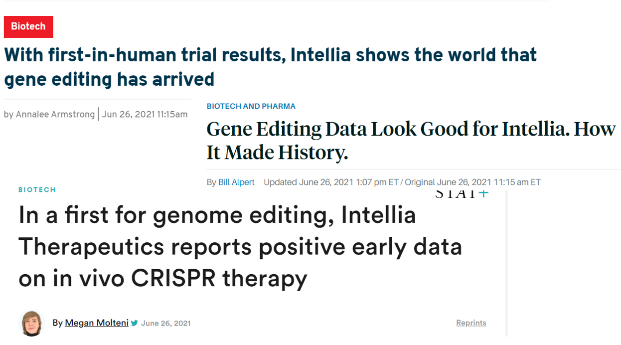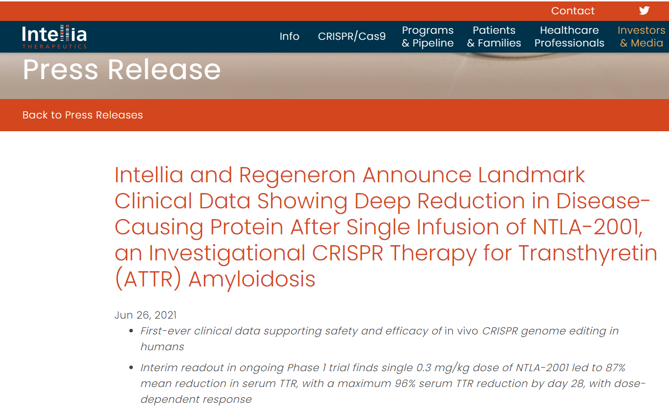 미국 현지시간 기준, 6월 26일 NTLA-2001의 인체 임상 결과가 발표되었다. 긍정적인 결과가 나왔다.