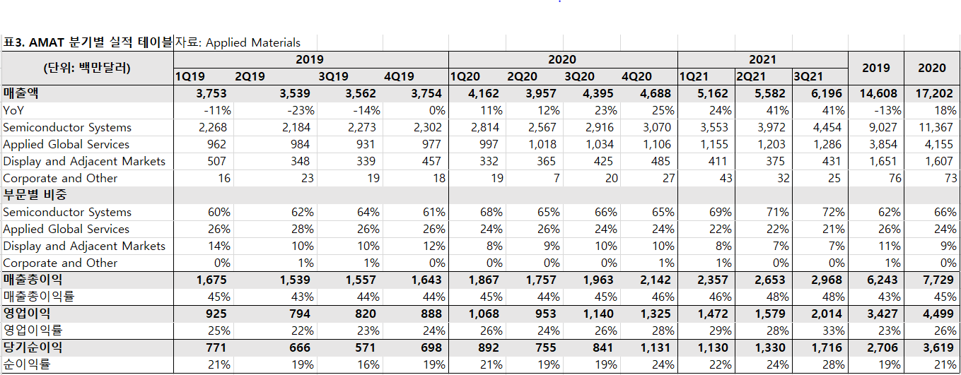 2020년은 반도체 사이클이 잠시 주춤했던 2019에 비해 YoY +18%의 매출 성장을 이뤄냈습니다. 하지만 2021년에는 2020년보다 YoY +40% 가량씩 증가하며 무섭게 성장하고 있습니다. 앞서 말했듯, 현재 반도체 기업들이 공격적으로 Capa를 증설하면서 투자에 열을 올리고 있기 때문이죠. 아무튼 매출 성장은 기가 막히게 이뤄지고 있다는 점을 체크해주시면 되겠습니다.